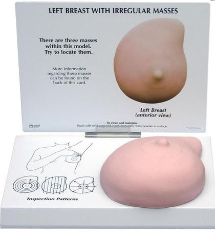 Model piersi do badania palpacyjnego żeńskiej piersi o wymiarach naturalnych wykonany z materiału przypominającego tkankę gruczołu sutkowego. Model zawiera guzek i zmianę mastopatyczną, które można badać palpacyjnie