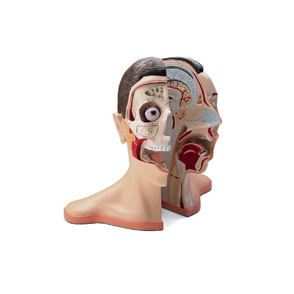 Model głowy z szyją podzielony w przekroju środkowy i oznaczony kolorami. Skóra oraz mięśnie twarzy na prawej części twarzowej modelu są usunięte, w celu przedstawienia głębszych struktur. Gałka oczna, pokrycie kostne nad zatoką szczękową oraz prawa połowa języka są wyjmowane.
