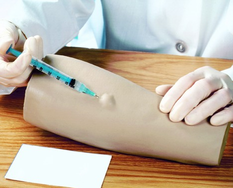 Symulator iniekcji śródskórnych posiada osiem miejsc do ćwiczenia wstrzyknięć śródskórnych – cztery na wewnętrznej i cztery na zewnętrznej stronie przedramienia.
