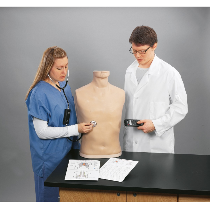 Osłuchowy trenażer serca i płuc ze specjalnym stetoskopem SmartScope™. Pomocny w treningu osłuchiwania różnych odgłosów serca i płuc do złudzenia przypominających odgłosy serca i płuc naturalnego pacjenta.