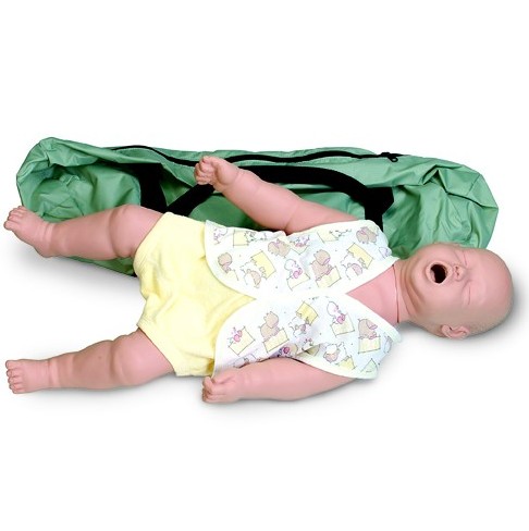 Model niemowlęcia do symulacji zadławień umożliwia ćwiczenie sytuacji związanych z usuwaniem obcych ciał z wnętrza otworu gardłowego w pediatrycznej grupie wiekowej. Umieszczając właściwie rękę i naciskając z dostateczną siłą, przedmiot wypada z wnętrza jamy ustnej. Model dostarczany z ubrankiem i przenośną torbą ochronną.