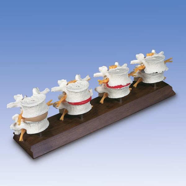 Pierwszy model przedstawia zdrowy dysk i zdrowe kręgi; drugi wypadniecie jądra galaretowatego; trzeci początkowy etap zwyrodnienia kości; czwarty przedstawia ciężko zdegenerowany dysk i kręgi.