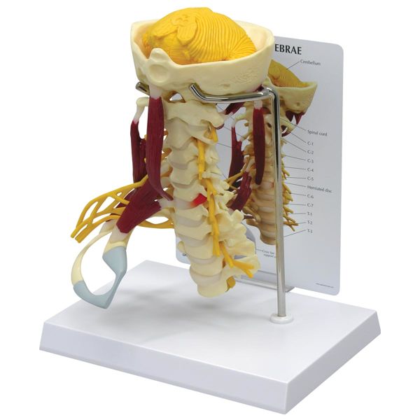 W47853 to wysokiej jakości, pełnorozmiarowy model odcinka szyjnego kręgosłupa. Model zawiera pień mózgu, kość potyliczną, dźwigacz, kręg obrotowy, z przepukliną dysku, T1 i T3, miękki móżdżek i pełny nerw z splotem ramiennym prawym. Na modelu widoczne są również mięśnie.
