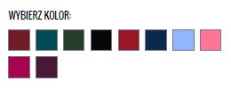 Dostępne kolory: Burgund, Błekit Karaibski, Ciemnozielony, Czarny, Czerwony, Granatowy, Jasnobłekitny, Koralowy, Malinowy, Śliwkowy