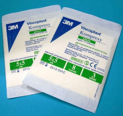 - Jałowe kompresy gazowe 100% bawełny, bielone nadtlenkiem wodoru, sterylne, wyjałowione radiacyjnie przeznaczone do opatrywania zarówno ran będących efektem urazów, zabiegów chirurgicznych oraz do innych typów zabiegów wymagających zastosowania w izbach przyjęć, gabinetach zabiegowych, na bloku operacyjnym.