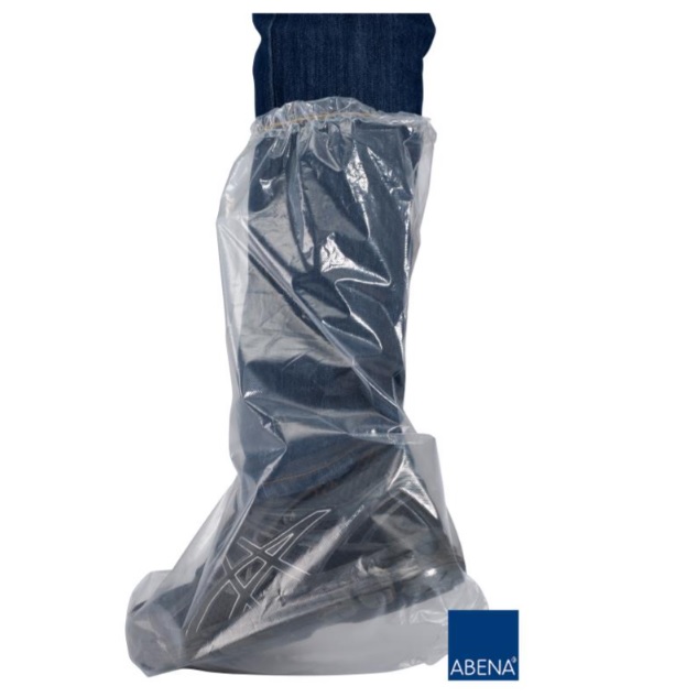 Jednorazowe ochraniacze na buty z tworzywa sztucznego, z gumką i taśmą antypoślizgową. Odpowiednie do użytku w wilgotnym środowisku. Zapobiegają poślizgnięciom i upadkom, jednocześnie chroniąc dolną część nóg przed rozpryskami i rozbryzgami, np. podczas kąpania pacjentów.