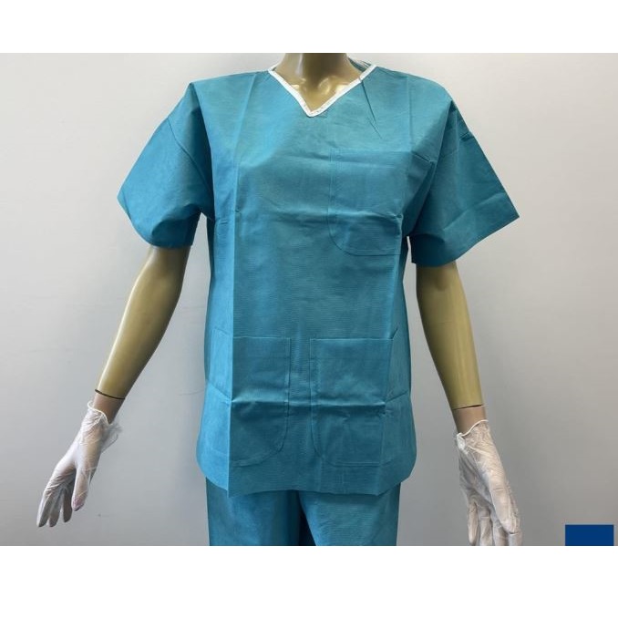 210422 - Ubranie operacyjne Classic, SMS 40 g/m2, antystatyczne, dekolt V obszyty, 3 kieszenie, spodnie z paskiem, niebieskie, rozm. M