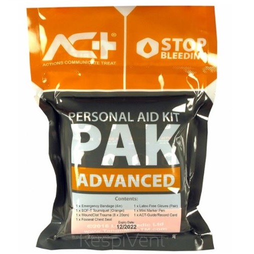 Osobisty zestaw ACT-PAK ADVANCED do tamowania masywnego zewnętrznego krwotoku. To niewielkich rozmiarów, ekonomiczny, szczelnie, próżniowo zamknięty, wodoodporny zestaw zawierający elementy niezbędne do podjęcia natychmiastowego działania.