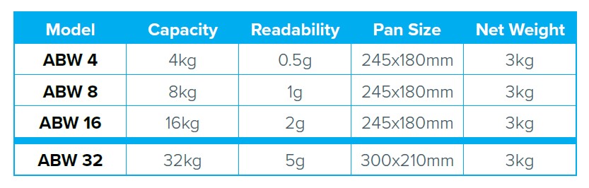 Zaprojektowane z myślą o zastosowaniach wymagających częstego mycia, wagi Aqua ABW są dostępne w następujących wersjach różnych zakresach ważenia i odczytu. Wagi ABW oferują stopień ochrony IP67 i są wyposażone w szalkę ze stali nierdzewnej, która jest odporna na wymagające środowiska przemysłowe i przetwórstwa spożywczego.