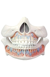 Model zamontowany na podstawie ze stojakiem. Naturalnych rozmiarów model: górna i dolna szczęka dorosłego człowieka. Dolna żuchwa jest ruchoma - w celu prezentacji przeżuwania. Model ukazuje kompletny zestaw zębów stałych z korzeniami i włóknami nerwów.