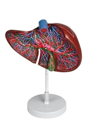 Model w 1,5-krotnym powiększeniu organu wątroby pozwalający zapoznać się z jego budową zewnętrzną i dzięki rozcięciu strukturą miąższu, przebiegiem kanału żółciowego i układem naczyń krwionośnych. Ukazuje rozciętą wątrobę w celu ukazania wewnętrznego rozmieszczenia tętnic i żył, żyły wrotnej i przewodu żółciowego pozawątrobowego. Model umieszczony jest na stojaku z podstawą.