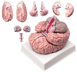 Model mózgu naturalnych rozmiarów podzielony wzdłuż szczeliny podłużnej mózgu na 2 części przyśrodkowe oraz na 9 części dalszych przedstawiających płaty: skroniowe, potyliczne, czołowe i ciemieniowe, móżdżek, pień mózgu i tętnicę podstawną. Na modelu przedstawiono także rozmieszczenie tętnic.