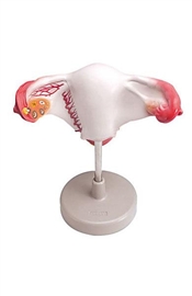Model w 1,5 - krotnym powiekszeniu, przedstawia otwartą pochwę, szyjke macicy, macicę, jajnik. W jajniku pęcherzyk jajnikowy w róznych fazach.