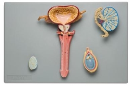Model umieszczony na tablicy. Naturalnej wielkości model pokazuje wszystkie narządy męskiego układu rozrodczego. Penis, prostata i pęchęrz moczowy są rozcięte wzdłuż w celu pokazania budowy anatomicznej wewnętrznej. Jądro jest częściowo pokazane osobno, przedstawiające wszystkie struktury wewnętrzne. Przedstawiono również w spospób szczegółowy przekrój jądra: jądro septula, sieci jądra, proste i skręcone kanaliki nasienne.