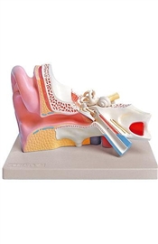 Model narządu zmysłu słuchu w 3. krotnym powiększeniu przedstawia ucho zewnętrzne, środkowe i wewnętrzne. Błona bębenkowa z młoteczkiem i kowadełkiem są wyjmowane.