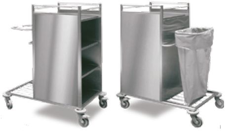 Wózek do przewożenia czystej i brudnej bielizny z dwoma półkami, bez drzwi. Blat z relingami zabiezpieczającymi o wymiarach 600x600 mm. Z tyłu szafki uchwyt na worek foliowy o pojemności 120 l bez pokrywy. Cztery kółka o średnicy 125 mm (2 z blokadą).