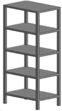 Regał z 5 pełnymi półkami montowanymi na stałe. Nóżki o wysokości 140 mm z możliwością wypoziomowania. Odległość między półkami: 370 mm.