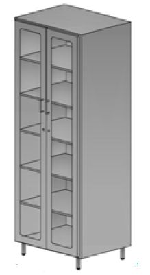 Szafa medyczna z drzwiami przeszklonymi otwieranymi skrzydłowo. Drzwi z zamkiem i uchwytem. 5 półek regulowanych. Podstawa szafy na nóżkach o wysokości 140 mm z możliwością wypoziomowania. Mebel modułowy.