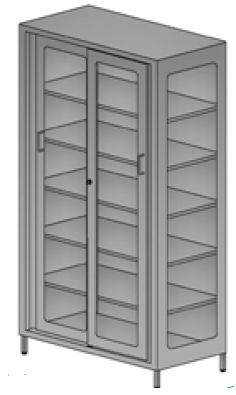 Szafa medyczna z drzwiami i bokami przeszklonymi. Drzwi otwierane przesuwnie. Drzwi z zamkiem i uchwytem. 5 półek regulowanych. Podstawa szafy na nóżkach o wysokości 140 mm z możliwością wypoziomowania. Mebel modułowy.