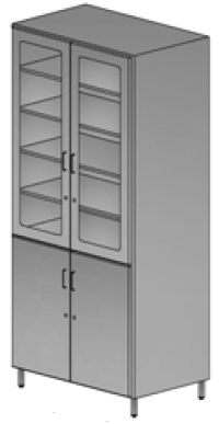 Szafa medyczna dwudrzwiowa dzielona: górna część - front przeszklony, dolna część pełna. Drzwi otwierane skrzydłowo. Drzwi z zamkiem i uchwytem. W górnej części 4 półki regulowane, w dolnej 1 półka montowana na stałe. Podstawa szafy na nóżkach o wysokości 140 mm z możliwością wypoziomowania.