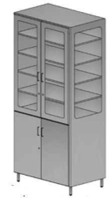 Szafa medyczna dwudrzwiowa dzielona: górna część - front i boki przeszklone, dolna część pełna. Drzwi otwierane skrzydłowo. Drzwi z zamkiem i uchwytem. W górnej części 4 półki regulowane, w dolnej 1 półka montowana na stałe. Podstawa szafy na nóżkach o wysokości 140 mm z możliwością wypoziomowania.