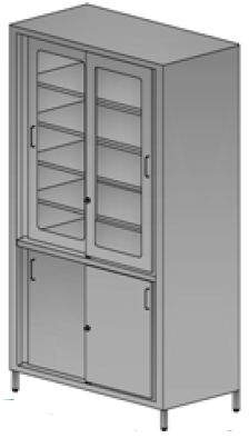 Szafa medyczna dwudrzwiowa dzielona: górna część - front przeszklony, dolna część pełna. Drzwi otwierane przesuwnie. Drzwi z zamkiem i uchwytem. W górnej części 4 półki regulowane, w dolnej 1 półka montowana na stałe. Podstawa szafy na cokole luba na nóżkach o wysokości 140 mm z możliwością wypoziomowania.