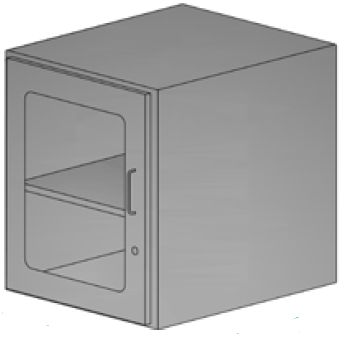 Szafka medyczna wisząca, drzwi pojedyncze z przeszklonym frontem, wewnątrz jedna półka.