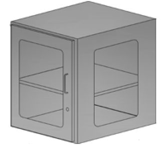 Szafka medyczna wisząca, drzwi pojedyncze z przeszklonym frontem i bokami, wewnątrz jedna półka.