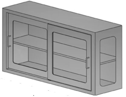 Szafka medyczna wisząca, drzwi podwójne z przeszklonym frontem i bokami. Drzwi otwierane przesuwnie. Wewnątrz jedna półka.