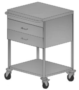 Szafka anestezjologiczna z dwoma szufladami. Blat prosty. Uchwyt do prowadzenia znajdujący się z boku szafki. Średnica kółek: 100 mm. Wymiary blatu: 650x600 mm.