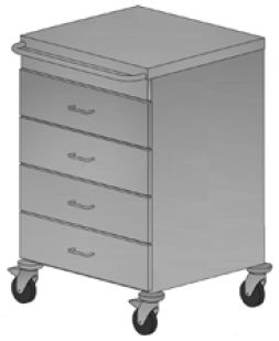 Szafka anestezjologiczna z czterema szufladami. Blat prosty. Uchwyt do prowadzenia znajdujący się z boku szafki. Średnica kółek: 100 mm. Wymiary blatu: 650x600 mm.