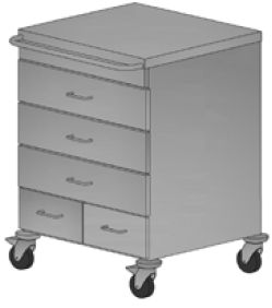 Szafka anestezjologiczna z pięcioma szufladami (3 duże, 2 mniejsze). Blat prosty. Uchwyt do prowadzenia znajdujący się z boku szafki. Średnica kółek: 100 mm. Wymiary blatu: 650x600 mm.