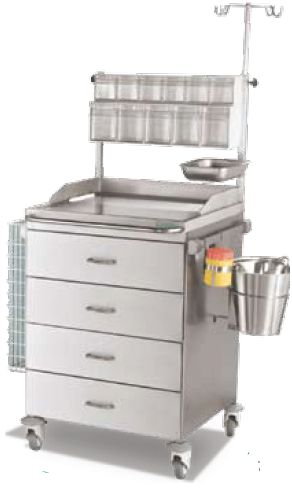 Wózek ratowniczy z czterema szufladami i wyposażeniem. Wyposażenie: 4 szuflady; nadstawka z 11 pojemnikami, w jednym rzędzie 5 pojemników, w drugim 6 pojemników; stojak do infuzji montowany do wózka; tacka oraz pojemnik na zużyte igły i wiaderko na odpadki - umieszczone z prawej strony wózka; z lewej strony wózka umieszczony uchwyt z dwoma pojemnikami na cewniki. Uchwyt do prowadzenia umieszczony z przodu wózka. Kółka o średnicy 100 mm. Wymiary blatu: 650x600 mm.
