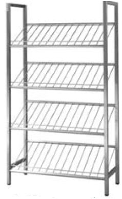 Regał przeznaczony do składowania basenów i kaczek. 4 stałe półki z prętów. Półki ukośne zakończone listwą zabezpieczającą.
