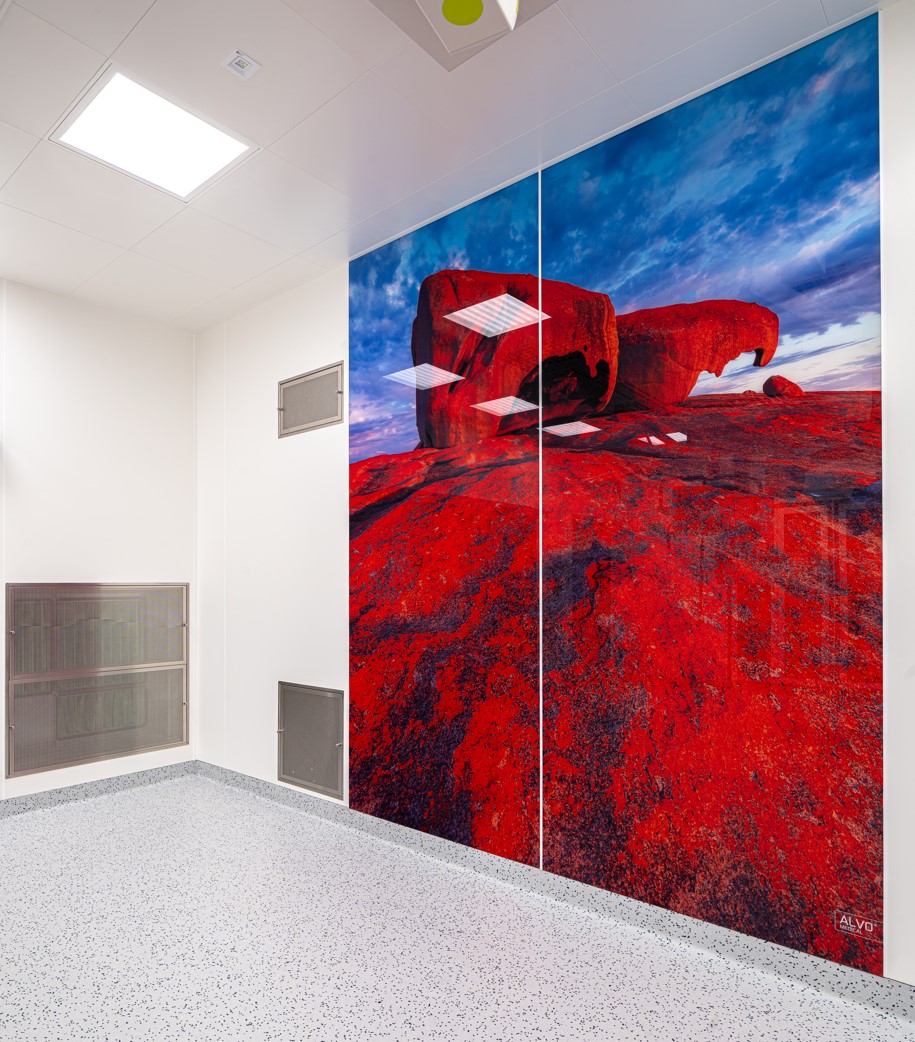 Wyjątkowa estetyka: Zabudowa modułowa tworzy nie tylko czyste, ale również atrakcyjne wizualnie, profesjonalne i uporządkowane środowisko pracy. Okna wychodzące na zewnątrz budynku lub z symulowanym widokiem na morze czy las istotnie poprawiają komfort personelu i przyśpieszają rekonwalescencję pacjentów. Czy wiesz, że ALVO Medical® była pierwszą firmą z branży technologii medycznych, która wprowadziła dzieła sztuki do sal operacyjnych? Nasz nowoczesny park maszynowy umożliwia produkcję wielkoformatowych paneli ściennych i drzwi z wybraną grafiką. Szpitale mogą wybrać nadruk z elementami sztuki, fotografii czy własnej identyfikacji wizualnej. Elementy graficzne można wkomponować w powierzchnie stalowe lub szklane, nadając pomieszczeniu prestiżowy wygląd. Odpowiednio dobrane kolory urozmaicają przestrzenie szpitalne i wpływają na dobre samopoczucie pacjentów i personelu medycznego.