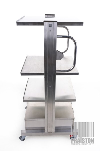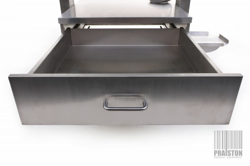 - Trzy półki regulowane oraz szuflada umieszczona w dolnej części wózka (możliwość doposażenia w dodatkowe półki za dodatkową opłatą),