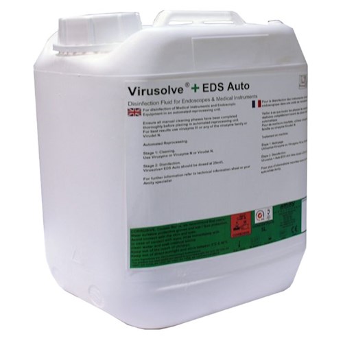 Virusolve+ EDS Auto Koncentrat jest opatentowanym płynnym preparatem do automatycznej dezynfekcji wysokiego poziomu narzędzi, endoskopów (giętkich i sztywnych) oraz wyrobów medycznych, w tym nieodpornych na wysoką temperaturę. Kombinacja składników aktywnych, w tym poliaminy nie zawiera toksycznych aldehydów, kwasu nadoctowego dzięki czemu nie wydziela toksycznych oparów. Virusolve+ EDS Auto jest najskuteczniejszym rozwiązaniem w zapobieganiu i eliminacji ryzyka zakażeń krzyżowych przenoszonych na narzędziach, endoskopach, wyrobach medycznych i powodowanych przez spory, prątki, bakterie, wirusy (osłonkowe i bezosłonkowe) i grzyby. Virusolve+ EDS Auto w przeciwieństwie do innych środków poza hamowaniem rozwoju drobnoustrojów niszczy ich materiał genetyczny. Produkt jest bezpieczny dla wszelkich materiałów (metali, szkła i tworzyw sztucznych), posiada delikatny zapach neutralny. Spełnia wymagania normy EN15883-4 i EN14885: EN14561, EN14562, EN14563, EN13727, EN13624, EN14476, EN14348, EN13704