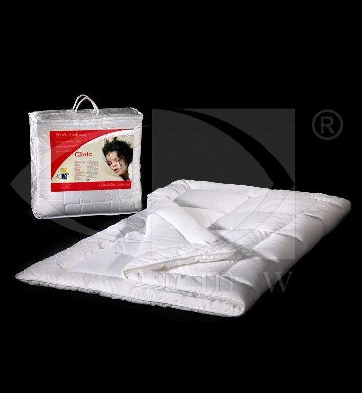 Coraz częściej zależy nam, by kołdra pod jaką śpimy była nie tylko ciepła i delikatna, ale również wytrzymała i funkcjonalna. Taką szansę stwarza nam Kołdra Clinic®, wykonana z wysokiej jakości materiałów. Swą trwałość,lekkość i puszystość kołdra zawdzięcza poliestrowym, termicznie skręcanym włóknom Hollow, jakie tworzą jej wypełnienie. Włókna te są gwarancją zachowania ciepła przez nasze ciało, jednocześnie pozwalając mu swobodnie oddychać. Mają także właściwości antyalergiczne, uniemożliwiają osadzanie się kurzu, dzięki czemu są doskonałe dla osób zmagających się z alergiami. Dodatkowo walkę z alergenami ułatwia możliwość prania kołdry w wysokiej temperaturze 95°C. Poprzez te właściwości lekkie kołdry z serii Clinic® używane są w szpitalach, klinikach, sanatoriach, hotelach oraz pensjonatach. Należą do wyjątkowo wytrzymałych, nawet mimo długiego użytkowania nie tracą nic ze swojej delikatności. Kołdra posiada pozytywną opinią kliniczną oraz Świadectwo Jakości Instytutu Leków w Warszawie, co potwierdza jej walory zdrowotne. Jej bezpieczeństwo dla zdrowia człowieka oraz środowiska naturalnego poświadcza Certyfikat OEKO-TEX® STANDARD 100. Temperatura prania: 95°C. Skład tkaniny: 50% poliester, 50% bawełna. Kolory: biały. Wypełnienie kołder: 100% Poliester silikonowany Hollow. Właściwości wypełnienia: włókna poliestrowe Hollow, termicznie skręcane, posiadające spiralny kształt i wysoką sprężystość. Zapewniają doskonałą izolację cieplną i puszystość. Sprawiają, że ludzkie ciało podczas snu oddycha. Przeciwdziałają osadzaniu się kurzu. Charakteryzują się właściwościami antyalergicznymi. PRODUKT ANTYALERGICZNY. WYRÓB MEDYCZNY PL/CA01 04605/W. Zdrowotne i jakościowe walory naszych wyrobów medycznych zostały potwierdzone pozytywną opinią kliniczną oraz Świadectwem Jakości Instytutu Leków w Warszawie. Wyrób posiada certyfikat OEKO-TEX ® STANDARD 100.