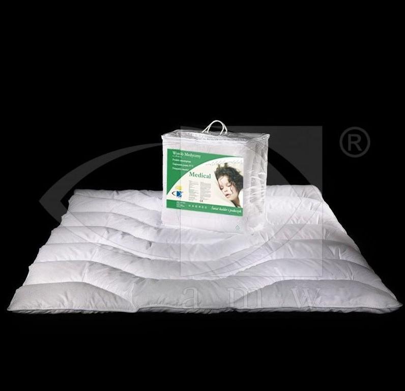 Kołdra Medical® to produkt, który doskonale spełnia najwyższe wymagania jakościowe i użytkowe. Pranie w wysokich temperaturach eliminuje szkodliwe dla człowieka drobnoustroje. Jest zatem idealny dla osób ze skłonnościami alergicznymi. Kołdra Medical jest szczególnie polecana dla hoteli i pensjonatów jako towar niezwykle trwały i odporny na długi okres użytkowania. Temperatura prania: 95°C. Skład tkaniny: 52% poliester, 48% bawełna. Kolory: biały. Wypełnienie kołder: 100% Poliester silikonowany Hollow. Właściwości wypełnienia: włókna poliestrowe Hollow, termicznie skręcane, posiadające spiralny kształt i wysoką sprężystość. Zapewniają doskonałą izolację cieplną i puszystość. Sprawiają, że ludzkie ciało podczas snu oddycha. Przeciwdziałają osadzaniu się kurzu. Charakteryzują się właściwościami antyalergicznymi. PRODUKT ANTYALERGICZNY. WYRÓB MEDYCZNY PL/CA01 04605/W. Zdrowotne i jakościowe walory naszych wyrobów medycznych zostały potwierdzone pozytywną opinią kliniczną oraz Świadectwem Jakości Instytutu Leków w Warszawie. Wyrób posiada Certyfikat OEKO-TEX® STANDARD 100. Wymiary 140x200 cm, masa 840 g. Wymiary 160x200 cm, masa 960 g. Wymiary 220x200 cm, masa 1320 g.