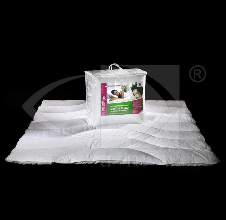 Każdy człowiek ceni sobie możliwość zdrowego snu, przynoszącego wypoczynek po męczącym dniu. Taką szansę może mu dać miękka i wygodna kołdra Medical® Frotte®. Lekka kołdra została stworzona przez wyjątkowe połączenie tkaniny frotte z jej jednej strony oraz polycottonu z drugiej. Dzięki zastosowanym w jej wnętrzu termicznie skręcanym poliestrowym włóknom typu Hollow, kołdra należy do doskonale miękkich, lekkich i delikatnych. Spiralna budowa włókien gwarantuje sprężystość i puszystość oraz świetną izolację ciepła przy jednoczesnym zapewnieniu możliwości oddychania skórze, co sprzyja naszemu zdrowemu i komfortowemu wypoczynkowi. Zaliczana jest do bezpiecznych antyalergicznych produktów. Dzięki temu, że utrudnia osadzanie się uciążliwego kurzu na swojej powierzchni, polecana jest dla małych dzieci, a także osób wymagających opieki, chorych na astmę i alergików.Medical® Frotte® należy do bardzo wygodnych w konserwacji kołder. Można ją prać w pralce w temperaturze 95°C bez utraty jej cennych walorów. Wyjątkowe zdrowotne i jakościowe wartości kołdry zostały poświadczone pozytywną opinią kliniczną oraz Świadectwem Jakości Instytutu Leków w Warszawie. Temperatura prania: 95°C. Skład tkaniny: 52% poliester, 48% bawełna + 25% poliester, 75% bawełna. Kolory: biały. Wypełnienie kołder: 100% Poliester silikonowany Hollow. Właściwości wypełnienia: włókna poliestrowe Hollow, termicznie skręcane, posiadające spiralny kształt i wysoką sprężystość. Zapewniają doskonałą izolację cieplną i puszystość. Sprawiają, że ludzkie ciało podczas snu oddycha. Przeciwdziałają osadzaniu się kurzu. Charakteryzują się właściwościami antyalergicznymi. PRODUKT ANTYALERGICZNY. WYRÓB MEDYCZNY PL/CA01 04605/W. Zdrowotne i jakościowe walory naszych wyrobów medycznych zostały potwierdzone pozytywną opinią kliniczną oraz Świadectwem Jakości Instytutu Leków w Warszawie. Produkt posiada Certyfikat OEKO-TEX® STANDARD 100. 140x200 cm, 160x200 cm, 220x200 cm