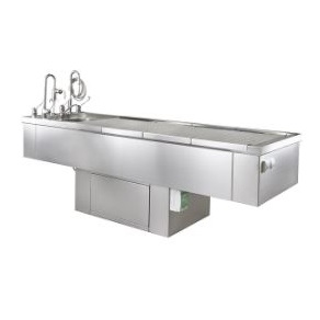 - Stół wyposażony w komplet baterii medycznych: Baterię łokciową medyczną oraz baterię ze słuchawką prysznicową i elastycznym wężem silikonowy o długości 2,5 m, mieszalnikiem gorącej i zimnej wody.