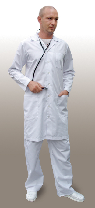 Fartuch męski z wykładanym kołnierzem, długi rękaw, zapinany na guziki, trzy kieszenie, pasek z tyłu. Fartuch dostępny również z krótkim rękawem oraz zapięciem na zatrzaski. Fartuch dostępny w rozmiarze: 42, 44, 46, 48, 50, 52, 54, 56, 58, 60, 62. Dla każdego rozmiaru dostępne wzrosty: 164 cm, 170 cm, 176 cm, 182 cm, 188 cm, 194 cm.