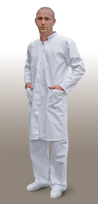 Fartuch męski za stójką, krótki rękaw, zapinany na zatrzaski, trzy kieszenie. Fartuch dostępny również z długim rękawem oraz zapięciem na guziki. Fartuch dostępny w rozmiarze: 42, 44, 46, 48, 50, 52, 54, 56, 58, 60, 62. Dla każdego rozmiaru dostępne wzrosty: 164 cm, 170 cm, 176 cm, 182 cm, 188 cm, 194 cm.