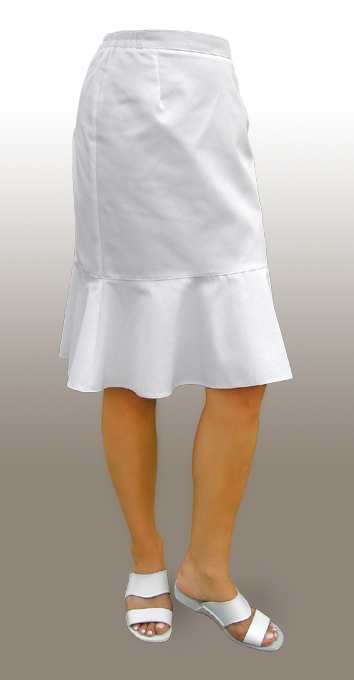 Spódnica z ozdobną falbanką, bez kieszeni, po bokach dwie gumki regulujące obwód talii, zapinana na suwak i guzik. Spódnica dostępną również w wersji z kieszeniami. Żakiet dostępny w rozmiarze: 34, 36, 38, 40, 42, 44, 46, 48, 50, 52, 54. Dla każdego rozmiaru dostępne wzrosty: 158 cm, 164 cm, 170 cm, 176 cm, 182 cm.