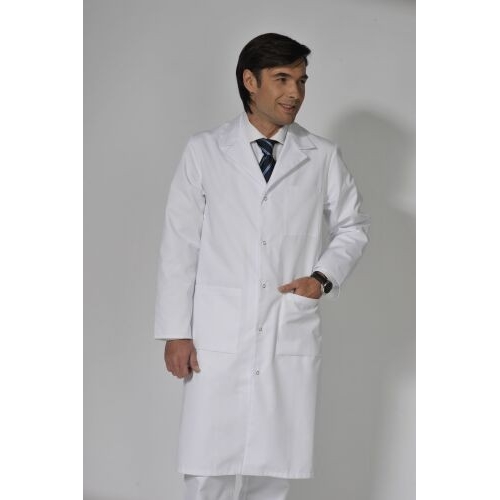 Fartuch męski klasyczny, zapinany na napy. Dwie kieszenie dolne, jedna na piersi.