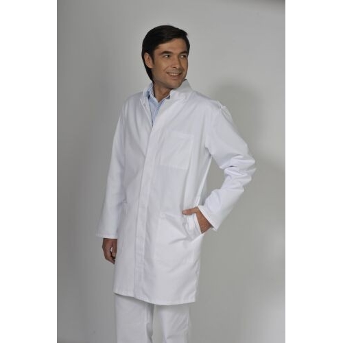 Fartuch męski krótki ze stójką, zapinany na kryte napy. Rozcięcia w szwach bocznych. Dwie dolne kieszenie, jedna na piersi. Tabela wymiarów dostąpna w załączniku.