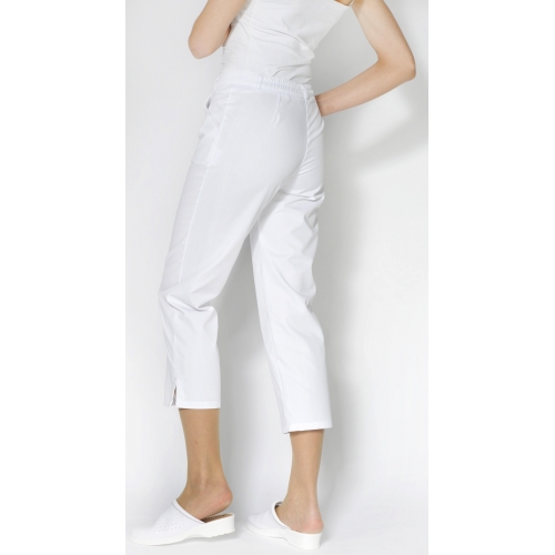 Spodnie damskie rybaczki z gumką z tyłu. Pęknięcia na końcach nogawek, dwie kieszenie po bokach.