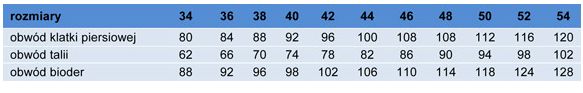 Tabela wymiarów dostąpna w załączniku.