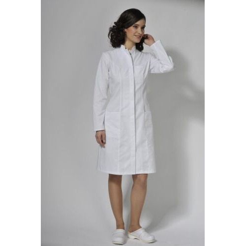 Sukienka ze stójką, zapinana na kryte napy. Dwie dolne kieszenie, jedna na piersi.