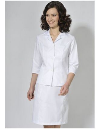 Żakiet krótki zapinany na guziki. Dwie dolne kieszenie, jedna na piersi.